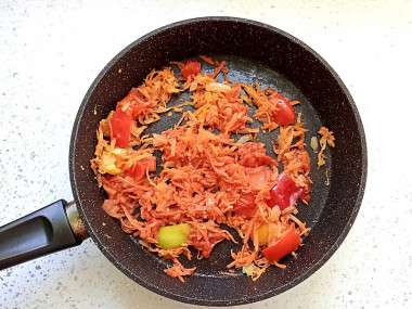 Для зажарки взяла лук, морковь, чеснок и болгарский перец. Перец был замороженный крупными кусочками, так их и оставила. Помидоры заменила на томатную пасту.