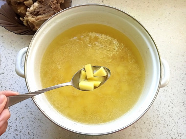 Выньте готовое мясо из бульона на отдельную тарелку. В кастрюлю отправьте картофель и лавровый лист. Варите около 10 минут.