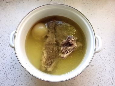 Бульон варила из говяжьих косточек с добавлением целой луковицы. Первую воду с пеной слила, залила чистой и варила на малом огне примерно два часа. Затем бульон процедила от мелких косточек, а кастрюлю промыла. Таким образом получился светлый, чистый, прозрачный бульон!