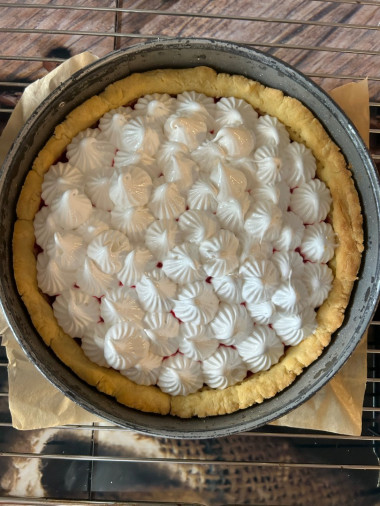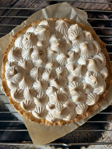 Сверху с помощью кондитерского мешка с насадкой «закрытая звезда» распределите взбитые белки. Можете просто аккуратно размазать белки ложкой.