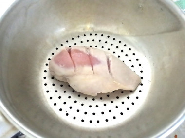 Вскипятите в кастрюле или сотейнике воду. Ее уровень рассчитайте таким образом, чтобы дуршлаг, поставленный на кастрюлю, не касался воды. Слегка смочите дно дуршлага водой и поставьте его на сотейник. Уложите на дно куриную грудку. Накройте дуршлаг с грудкой крышкой подходящего размера.