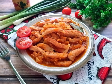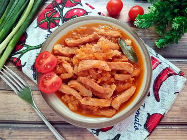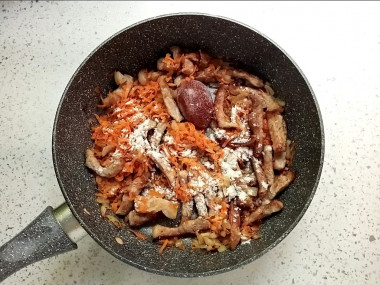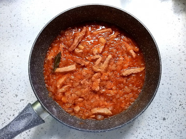 Для этого взяла кусочек свиного карбоната. Жира в нем нет, поэтому готовить мясо пришлось подольше, чтобы оно стало мягким. Сначала обжарила полоски свинины, затем смешала с луком и морковью. Через 10 минут посыпала мукой и добавила томатную пасту. Специи не добавляла, только посолила и в конце положила лавровый листочек. Тушила мясо примерно пол часа под крышкой.