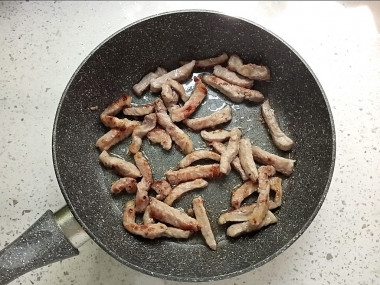 На сковороде разогрейте растительное масло, выложите кусочки мяса. Обжарьте свинину на умеренно сильном огне, помешивая, чтобы кусочки покрылись румяной корочкой. Мясо немного посолите. Выбрать сковороду для приготовления и масло для жарки помогут статьи в конце рецепта.