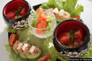 о, как интересно! салат в стаканчике! думаю - любые порционные тарелочки подошли бы, но стаканчики сами по себе - уже необычно и интересно. и рецепт хороший - рыбка со свежими овощами, вкусно!