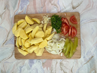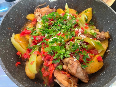Болгарский перец у меня был замороженный, оставшийся после зимних заготовок. Курицу обжарила до золотистой корочки, а затем поочерёдно все овощи: картошку, лук, перец. В конце всё соединила, добавила помидоры, чеснок, зелень и немного воды, перемешала и накрыла крышкой. Тушила до готовности.