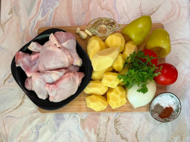 Как сделать жаркое из курицы с картошкой в казане? Очень просто. Для начала подготовьте необходимые ингредиенты по списку. Филе курицы можете использовать с грудки или бедра птицы. Помимо указанных специй можете использовать свои по вкусу, например, хмели-сунели, молотый кориандр и т.д. Указанные в рецепте овощи и специи можете заменять или дополнять по вкусу.