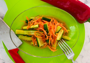 Доброго дня, хозяюшки! Я этот салат "Огурцы с морковью по корейски на зиму", как вариант, делаю и с молодыми кабачками. Добавляйте, чего душа просит. И разноцветный перец, и лук, и зелень. Рецепт отличный и нетрудоемкий. Еще, я стерелизую готовый салат в духовке, что значительно облегчает жизнь. Ставлю в холодную духовку на 10 мин. на максимальной температуре, чтобы нагрелась банка, затем уменьшаю температуру до 160 градусов и выдерживаю необходимое количество минут, в зависимости от объёма баночек. Достаю. Закатываю. Красота! Можно сразу закрыть большой объем. Советую, в самый низ духовки поставить поддон с водой, может заливка поддекать. Либо, не накладывайте до самого верха, овощи чуть поднимутся. Способ очень хорош!