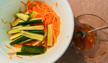 Искала рецепт из того, что было в холодильнике на салат. Нашла Салат огурцы по-корейски на зиму с морковью. Только сделала я его не на зиму, а к ужину, но всё равно зимний получился, на улице ведь январь.