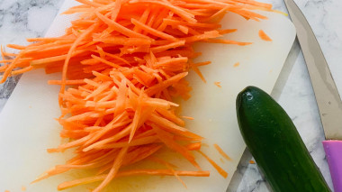 Морковь вымойте в проточной воде, очистите и натрите на терке для корейской моркови, переложите в миску, слегка посолите, и немного помните руками, чтобы она стала мягче. Если нет специальной терки, можно нарезать морковь ножом тонкой соломкой. Соль берите от общего количества, указанного в рецепте.