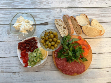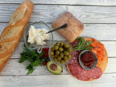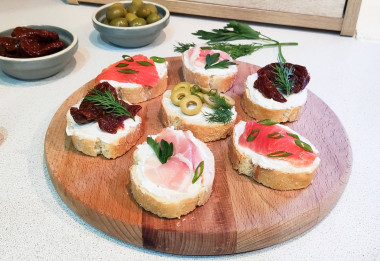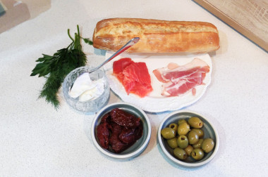 Как сделать испанский тапас? Подготовьте продукты. В качестве основы для этой закуски подойдет небольшой багет или чиабатта. Сыр возьмите любой творожный типа Хохланд или Альметте. Для верхнего наполнения подойдут любые колбасы, свежие или запеченные овощи, соленая рыба, жареные креветки, оливки, маслины, орехи или семечки. Я взяла балык, вяленые помидоры, красную рыбу и оливки.