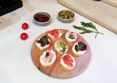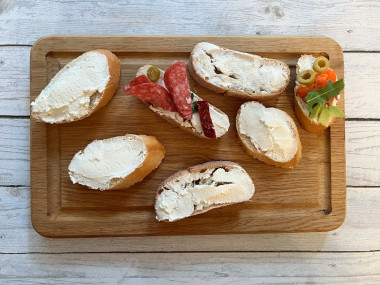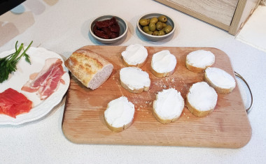 Больше всего мне понравилось, что в рецепте можно использовать разные продукты и комбинировать их по своему вкусу. Я купила свежий хрустящий багет и итальянскую чиабатту. Для намазки использовала творожный сыр.