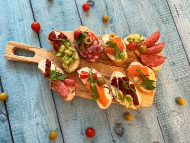 Кроме различных видов колбас для тапаса можно взять любое мясо, запеченное или вяленое. Очень популярен в Испании тапас с хамоном. Советую брать уже готовую нарезку — тогда кусочки будут тонкие и красивые. Из морепродуктов отлично подходят креветки. Из овощей — помидоры, огурцы, перец, даже редис. Все это можно миксовать между собой, сочетая с различными намазками и соусами. Чтобы тапас смотрелся еще эффектнее, кусочки хлеба можно проткнуть шпажками, проколов ими креветку, оливку или помидорку.