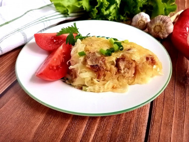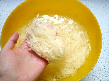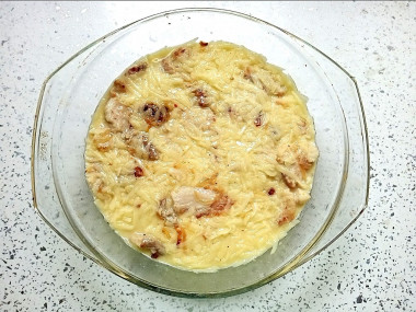 Я не очень люблю крахмал в картошке, поэтому натерла ее прямо в воду. Затем несколько раз промыла. Полосочки картошки получились полупрозрачными. Смешала все вместе, приправила специями для картофеля и залила молочно - яичной смесью.