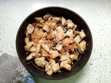С грудинки срезала шкурку и нарезала сало с мясом небольшими ломтиками. Обжарила их с луком, посолила. Запах при этом такой аппетитный, сразу кушать захотелось).