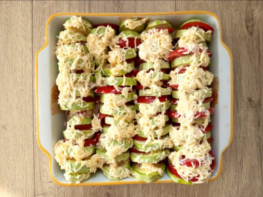 Залейте сливочно-сырной массой кабачки с помидорами, сыр останется при этом сверху — распределите его равномерно.