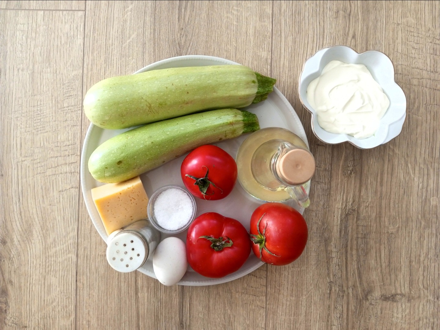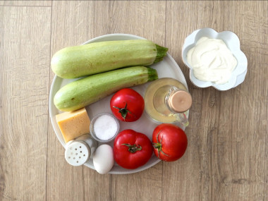 Как запечь кабачки, помидоры, сыр, чеснок в духовке? Подготовьте продукты. Кабачки возьмите молодые — у них тонкая кожица, которую не нужно срезать и практически нет семян. Помидоры возьмите размером примерно с диаметр кабачка. Сливки используйте 25-30%. Включите духовку на 180 градусов.