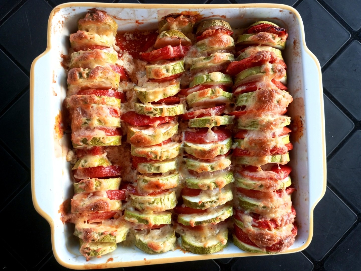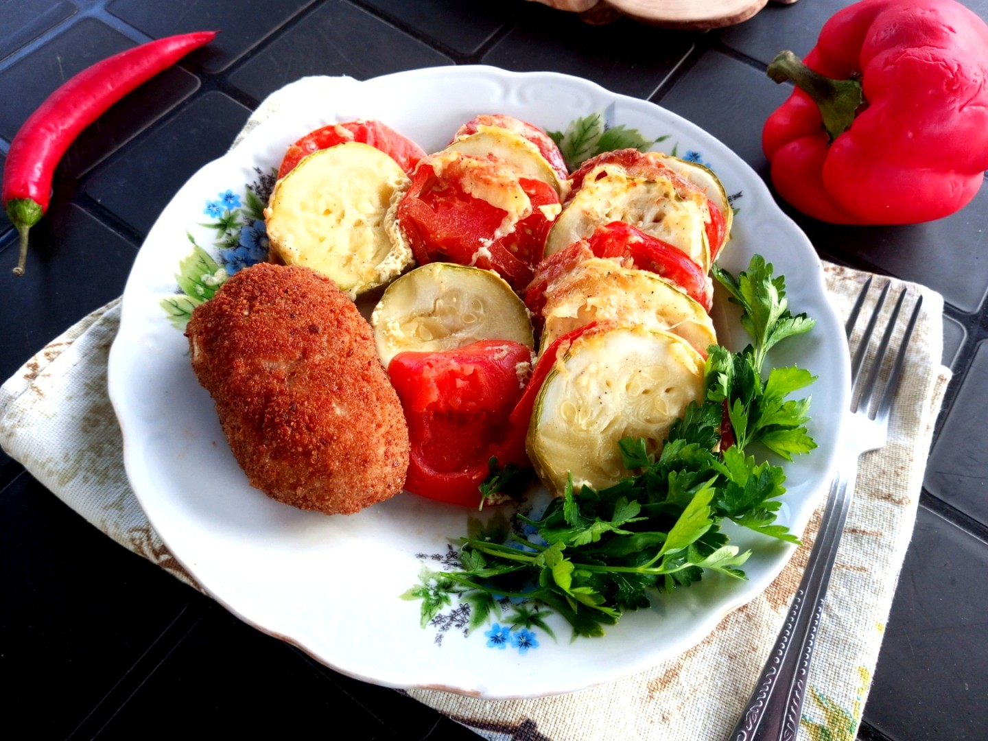 Начался сезон кабачков и очень хочется разнообразить меню с этим востребованным овощем. Но кабачки обычно быстро жарятся, но в духовке ведут себя немного иначе. У меня квадратная форма размером 25х25. Двух кабачков и трех помидор мне на нее не хватило, поэтому я добавила ещё один кабачок и один помидор. Через 30 минут запекания при температуре 180 градусов кабачки у меня остались полусырые, поэтому верх я прикрыла фольгой для ускорения процесса готовки. Еще 40 минут запекания - результат практически тот же. Пришлось переключать духовку на температуру 220 градусов и в режиме конвекции доводить блюдо до готовности. В общей сложности кабачки у меня запекались 1 час 30 минут. У всех духовки разные, поэтому лучше учесть это при приготовлении. Из минусов - долго готовится. Из плюсов - диетическое и полезное. С котлеткой на ужин получилось неплохо.