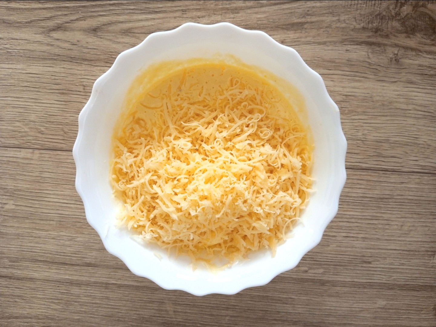 Для заливки вбейте в пиалу яйцо, влейте сливки. Выдавите через пресс зубчик чеснока. Добавьте натертый на терке сыр. Можете немного посолить и поперчить заливку.