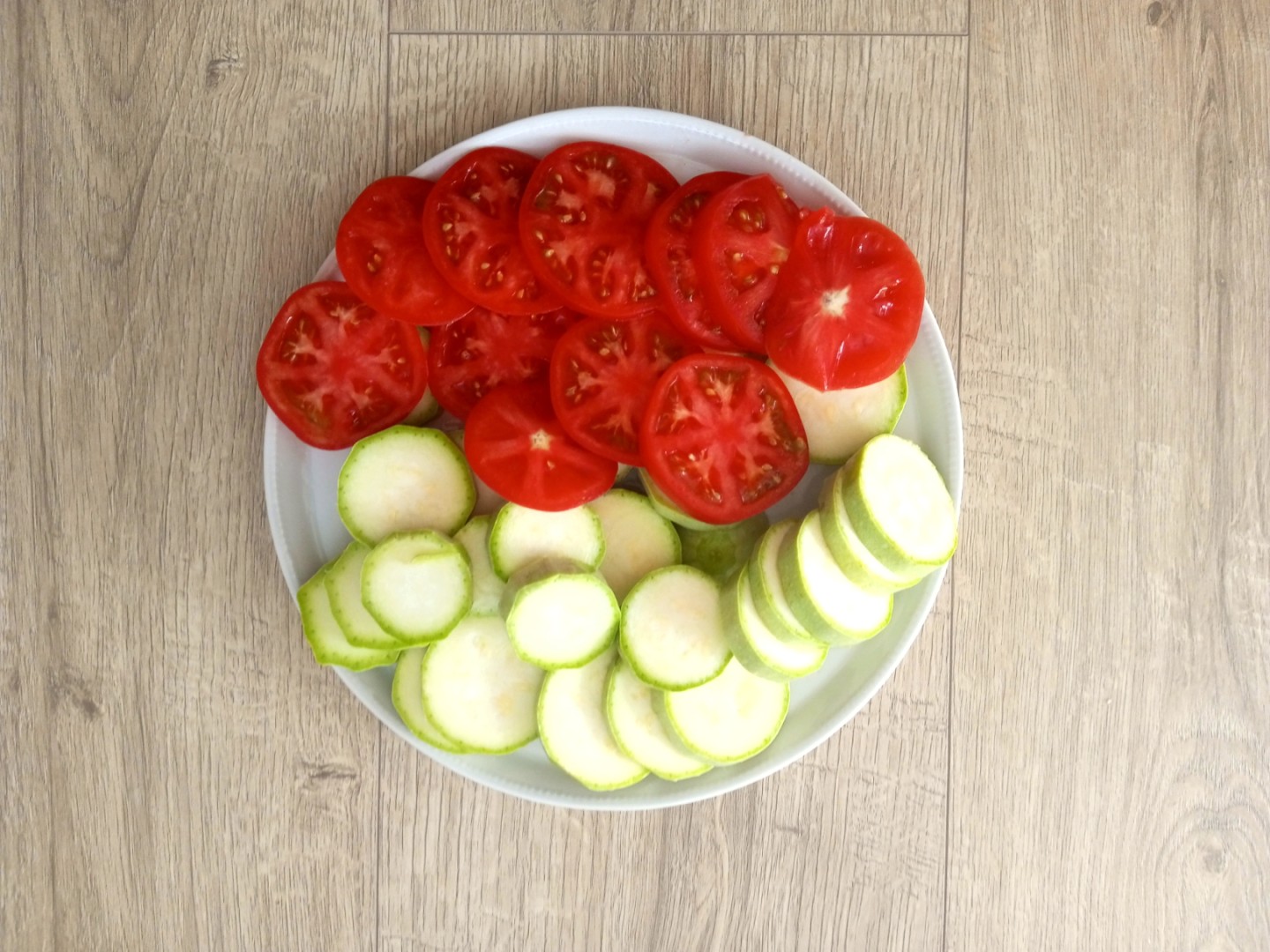 Возьмите подходящую форму для запекания. С выбором поможет статья по ссылке в конце рецепта. Смажьте ее небольшим количеством растительного масла. Уложите в форму кружочки кабачка и помидоров, чередую их через один. Посолите и поперчите овощи сверху.