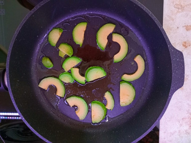 Разогрейте на небольшом огне сковороду, влейте на нее растительное масло для жарки. О тонкостях выбора сковороды для яичницы читайте в статье под шагами. Выложите в масло кусочки нарезанного авокадо. Подержите его на огне около минуты. Переворачивать кусочки не нужно.