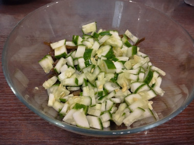 Свежий огурец помойте и обсушите. Нарежьте его средними кубиками. Если у огурца плотная кожица, то срежьте ее.