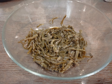 Морскую капусту выложите на сито, чтобы стекла лишняя жидкость. Можно слегка отжать ее при помощи ложки. Если капуста длинная, нарежьте ее ножом или ножницами.