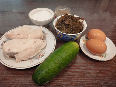 Как сделать салат из морской капусты без майонеза? Подготовьте продукты. Заранее отварите куриные грудки в подсоленной воде. Грудки можно заменить на другие части курицы, но калорийность будет другая. Лучше оставить остывать мясо в бульоне, так курица в салате будет мягче и нежнее. Морскую капусту можно взять готовую или сушеную, предварительно подготовив ее.