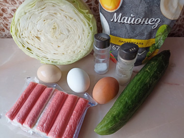 Как сделать крабовый салат с капустой, яйцом и огурцом? Ничего сложного тут нет. Для начала подготовьте ингредиенты по списку. Майонез можете заменить сметаной, натуральным йогуртом или любое растительное масло. Рецепты домашнего майонеза вы найдёте после последнего шага.