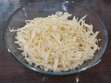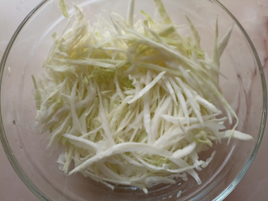 У свежей капусты снимите верхние поврежденные листья. Капусту нашинкуйте, обходя плотные жесткие листья вокруг кочерыжки.