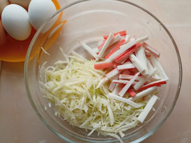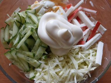 В миске соедините белокочанную капусту, яйца, огурцы, крабовые палочки. Заправьте салат майонезом, посолите, поперчите и перемешайте. По желанию можете добавить свои специи по вкусу.