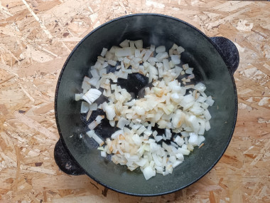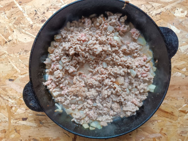 Добавьте на сковороду фарш. Обжарьте его, размешивая и разбивая комки, до изменения цвета.