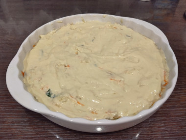 Форму для выпечки (Ø 20 см) выстелите пергаментом и смажьте растительным маслом. Выложите половину заливного теста и равномерно разровняйте. Поверх теста равномерно распределите начинку. Информацию о формах для выпечки вы найдете в конце рецепта под шагами.
