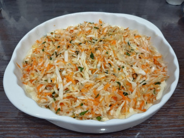 В миске соедините капусту, морковь, зелень. Все посолите и перемешайте. Помните капусту руками, чтобы она пустила сок.