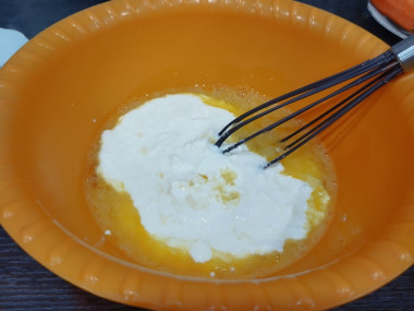 Добавьте натуральный йогурт и снова взбейте. Йогурт лучше берите пожирнее. У меня 6 %. Йогурт можете заменить сметаной жирностью 10-15%.
