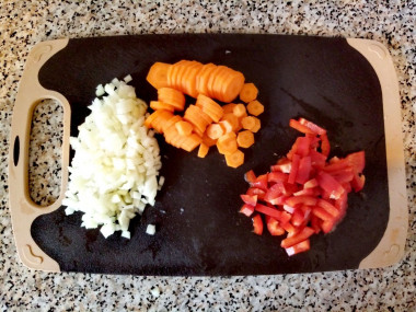 Болгарский перец помойте, очистите от семян и плодоножки. Нарежьте овощ средними кубиками.