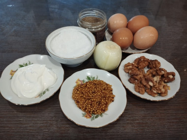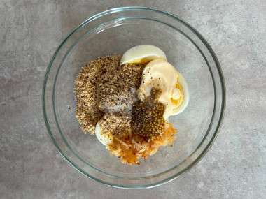 В миску выложите яйца, жареный лук, грецкие орехи, горчицу и майонез. Все посолите и поперчите. По желанию можете добавить свои специи по вкусу. Я люблю добавлять уцхо-сунели, эта специя придаст блюду пряный ореховый привкус.
