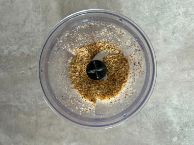 Затем измельчите орехи в блендере или пропустите через мясорубку. Также можете сложить орехи в пакет и пройтись по ним скалкой. Все равно потом мы будем взбивать всю массу блендером и они еще больше измельчатся.