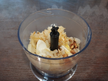 В чашу блендера выложила остывшие и порезанные дольками яйца, лук, зернистую горчицу, сметану, орехи,соль. Измельчила блендером до пастообразного состояния.