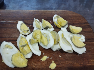 Яйца сварите вкрутую, охладите, очистите и разрежьте пополам. Яйца берите крупные отборные. Если яйца небольшие, лучше возьмите 5 штук. О том, как как выбирать, как сварить, чем отличаются яйца разной категории и полезные советы по теме читайте в статье после рецепта.