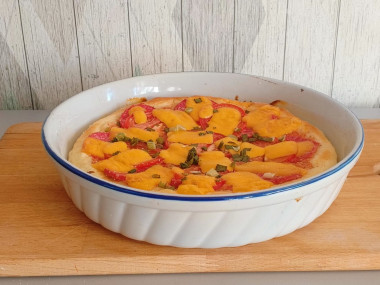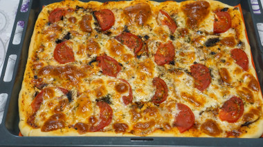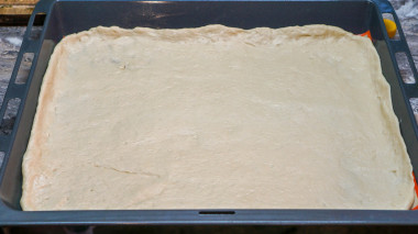 Так как специальной круглой формы для пиццы у меня нет, то весь объем теста я раскатала на большой противень.