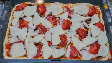 На основу распределите помидоры и моцареллу. Верните пиццу в духовку на 5-10 минут до расплавления сыра.