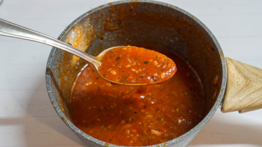 В чашу блендера выложите помидоры, пропущенный через пресс зубчик чеснока, травы и специи. Взбейте все в блендере до получения однородного соуса. Можете взять уже готовый магазинный соус для пиццы.