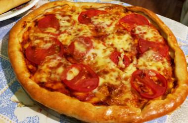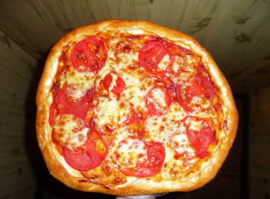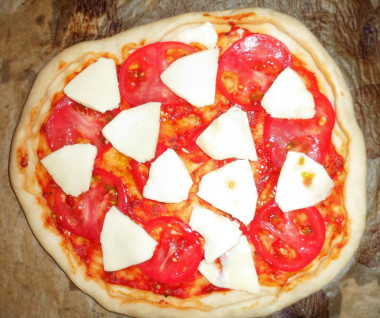 Как ни странно, но до сих пор я ни разу не делала пиццу "Маргарита", хотя это классический вариант приготовления пиццы. Поэтому, только увидев невероятно аппетитное фото пиццы как в пиццерии в домашних условиях, я сразу захотела попробовать испечь такую. Сказано-сделано. Для начала испекла только одну пиццу и сразу пожалела, что не две. Минимум ингредиентов, а такой невероятно красивый вид и ничем не уступающий виду вкус! В другой раз можно добавить немного ветчины или руляды в эту пиццу, по-моему, от этого она только выиграет. PS: края у пиццы в самом конце выпечки я смазала яичным белком, так как серединка уже была практически готова, а края оставались бледноватыми.