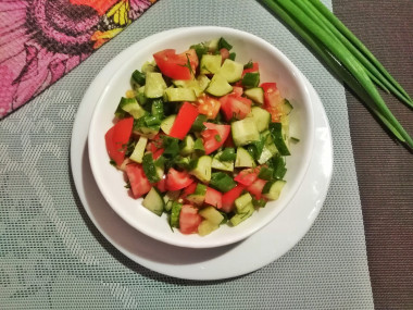 Обожаю овощные салатики! Решила попробовать приготовить по вашему рецепту лёгкий летний салат помидоры огурцы зелень. Очень простой в приготовлении овощной салат хорошо дополнил наш шашлык. Я использовала тепличные огурцы, помидоры и зелень. Овощи нарезала кубиками, кожицу с огурца не снимала, огурчики молоденькие и шкурка мягкая. Добавляла традиционную зелень по совету автора - это зелёный лук и укроп. Заправила салат домашним растительным маслом и морской солью. Никаких других ингредиентов не добавляла, не фантазировала. Приготовила очень вкусный, лёгкий и простой салат за считанные минуты.