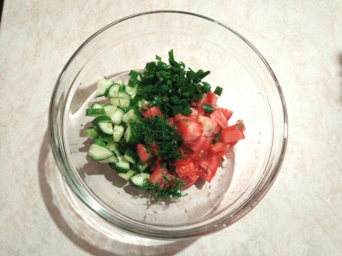 2.Нарезать кубиками огурцы, затем помидоры. Можно покрошить зелень ( традиционно , это зеленый лук или укроп)