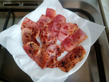 Бекон разрежьте на половинки — так его будет удобнее жарить. Выложите его на разогретую сухую сковороду и на сильном огне обжарьте с обеих сторон в течении пары минут до румяности. Затем огонь убавьте и дожарьте, периодически переворачивая, до хрустящего состояния. Когда это произойдет, снимите бекон на тарелку с бумажным полотенцем — оно впитает лишний жир. С выбором сковороды поможет отдельная статья по ссылке в конце рецепта.