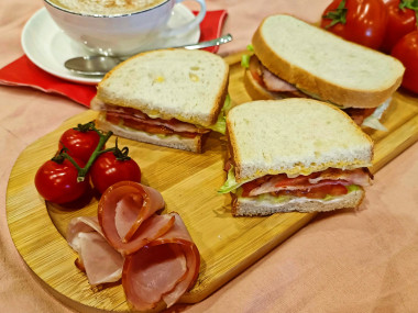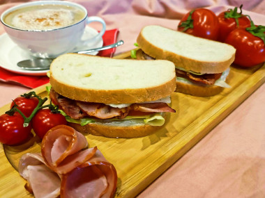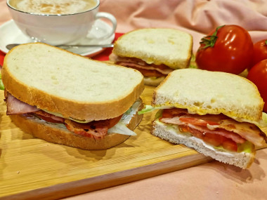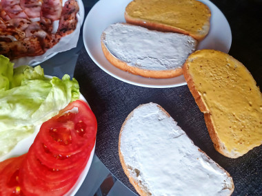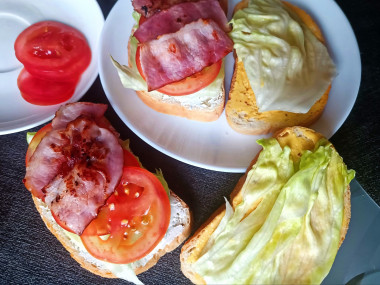 Первым делом обжарила бекон. У меня был сырокопчёный, но с небольшим количеством прожилок, поэтому сильно зажарить его не получилось. Впрочем, я даже рада – люблю мягкий бекон. Хлеб нарезала ломтиками, помидор – тонкими кружочками, салат помыла и обсушила. Два ломтика хлеба смазала творожным сыром, два других – горчичным соусом, как и рекомендовалось в рецепте. На каждый кусочек хлеба положила по листику салата, затем по 4 кружочка помидора и ароматный бекон. Сверху накрыла другим ломтиком хлеба, смазанным горчичным соусом и листиком салата, слегка прижала.