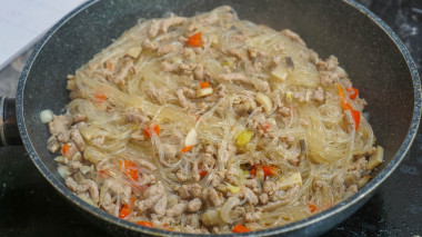 Фарш использовала свино-говяжий, Замороженной мексиканской смеси у меня в запасе не было, поэтому использовала овощи, которые были в холодильнике - репчатый лук, болгарский перец, помидоры. Овощи и свежие шампиньоны нарезала небольшими кубиками, добавила к фаршу и обжарила. Далее в сковороду добавила пару "моточков" фунчозы, добавила горячей воды из чайника, всыпала соль и специи. Оставила томиться под крышкой минут на 10, пока жидкость не впитается. На приготовление блюда у меня ушло не более 30 минут. Фунчоза с фаршем и овощами получилась очень вкусной, сочной и сытной. За время томления в сковороде фунчоза сохранила свою форму, осталась упругой и не переварилась.