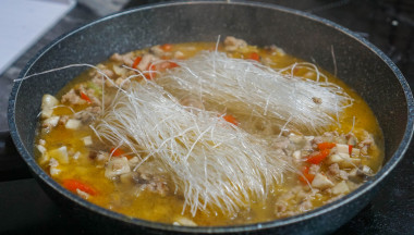 В овощно-мясной смеси делаем углубления до дна сковородки и кладем в них фунчозу. Это позволит лапше лучше и быстрее впитать жидкость, что наполнит её вкусом мяса, овощей и грибов.