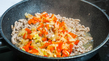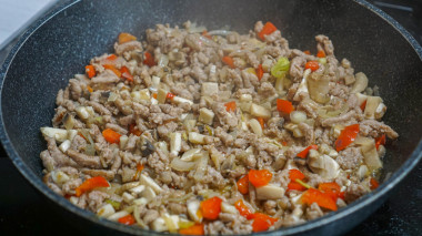 На обжаренный фарш высыпаем овощи, равномерно распределяем по всей поверхности фарша. Накрываем крышкой и убираем с конфорки на время выполнения следующего шага.